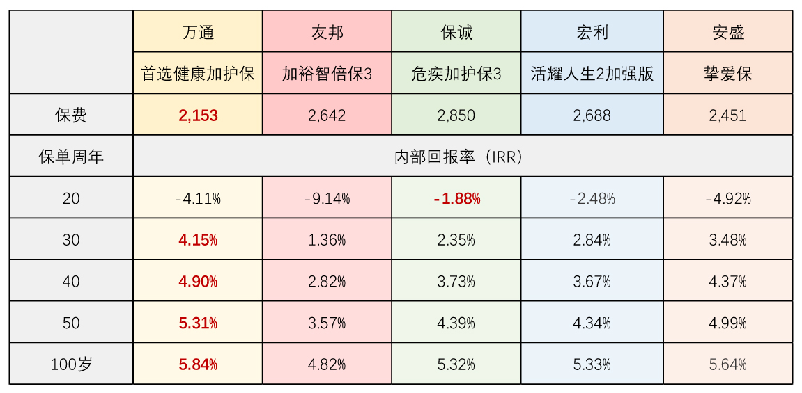 万通的女性保单是反其道而行之,整体的保费是相比男性是略微下调的,其他都是上调的。而且保单整体的收益率是和男性的一样,其他各家大佬也都是收益率有所下调。如果是想投保重疾险的小姐姐,还是可以优先考虑万通的首选健康加护保。