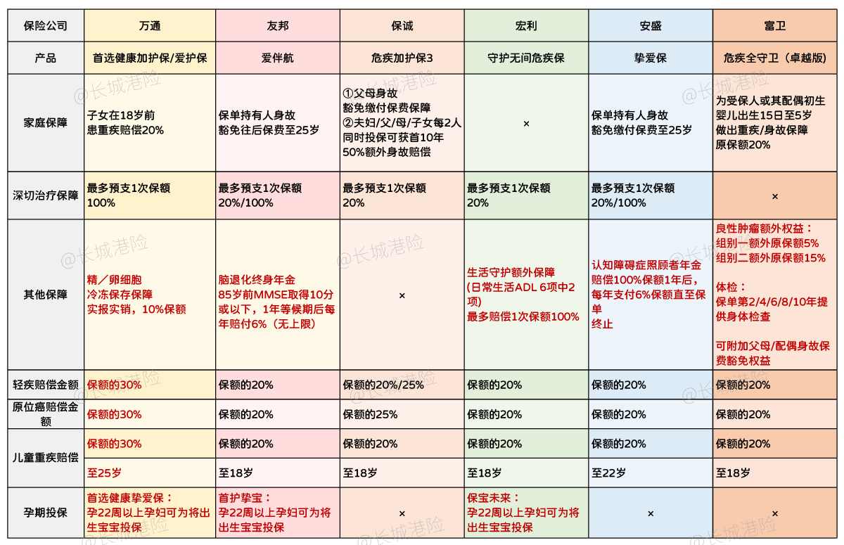 今天写的这六款产品,在重疾多次赔付中,除了安盛和友邦是一个样的,其他真的是各有特色;这抉择可以结合自身的需求做最终的决定。