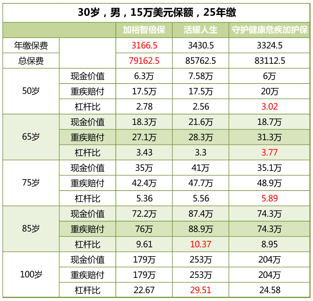 以30岁不吸烟的男士为例,投保15万美元保额,分25年缴费,这三款重疾险分别能给到他什么保障?