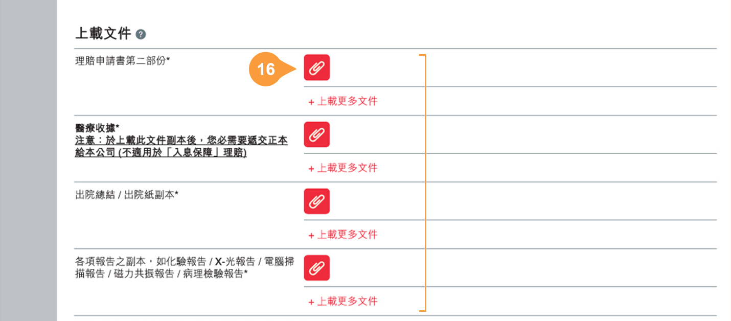 注意:为令个案赔偿更顺畅,请同时递交相关索偿的医疗收据及收费单正本。另外,我们会向您发出短讯通知个案获批核或须要补充附加文件。