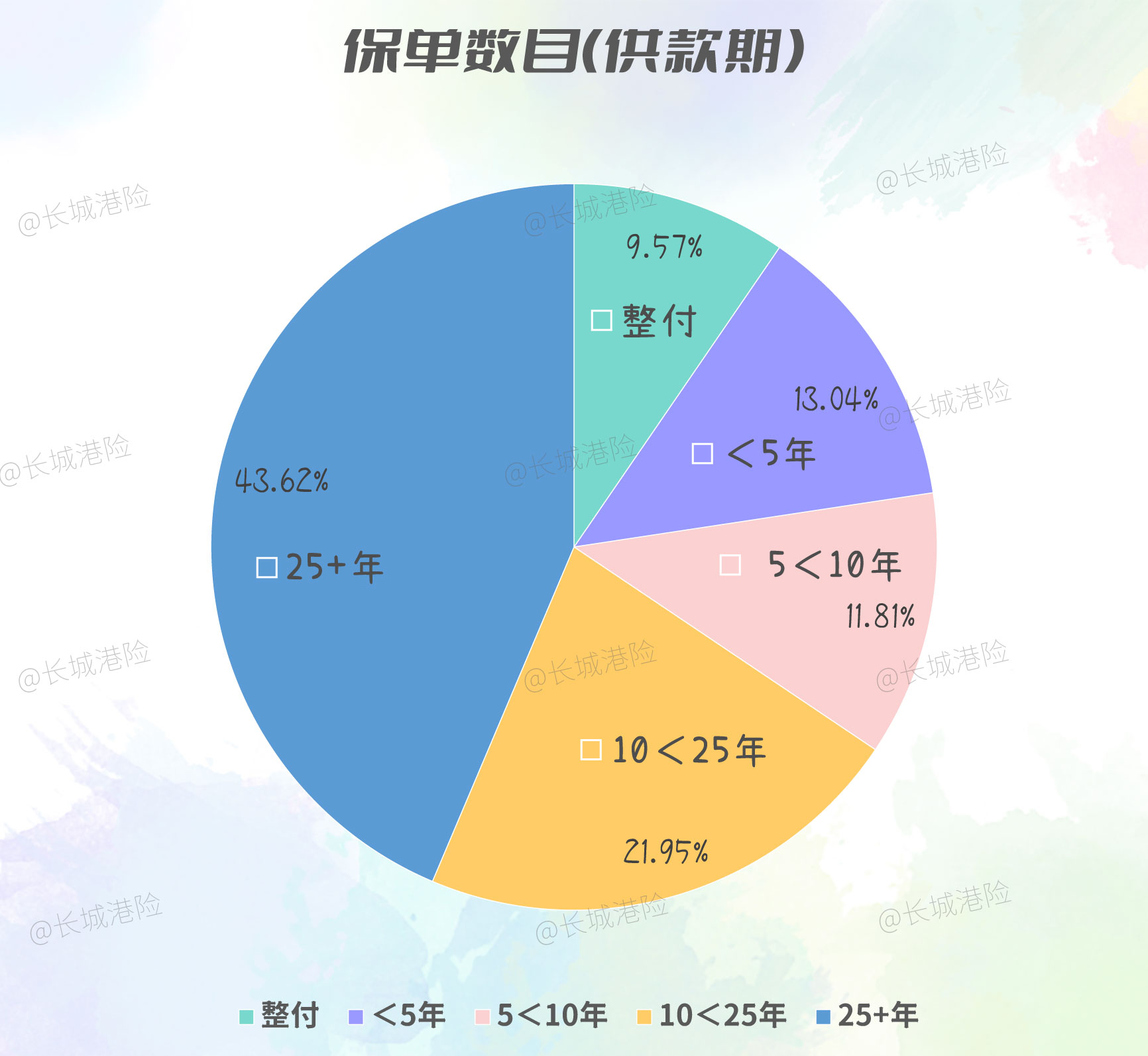 NO.1整付保费占39.56%;NO.2小于5年供款期占30.64%;NO.3在5年-10年间供款期占25.17%;