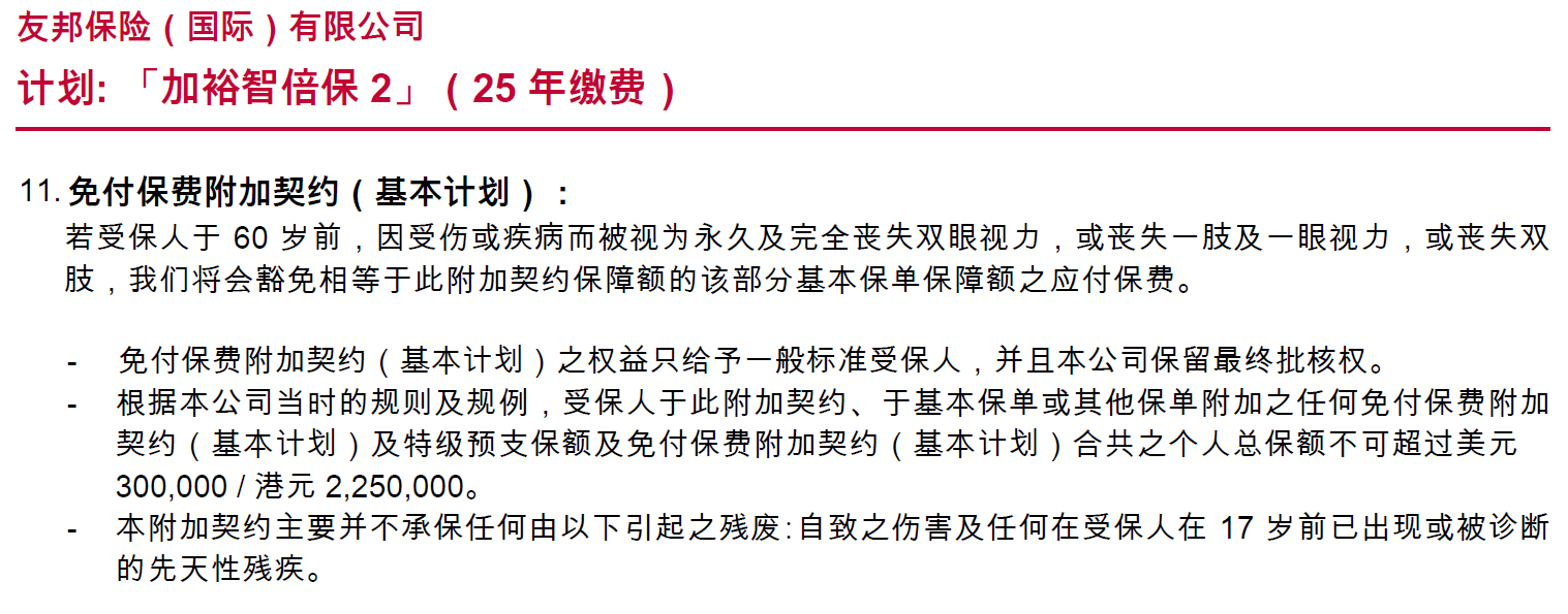 在香港友邦的一款终身寿险中,也有免付保费附加契约。豁免条款和重疾保险的豁免条款相同,豁免上限为30万美元保额对应的保费。不过对于人寿保险,免付保险附加条款是有一定实际意义的,因为断肢和失明并不是纯人寿保险的理赔范围。